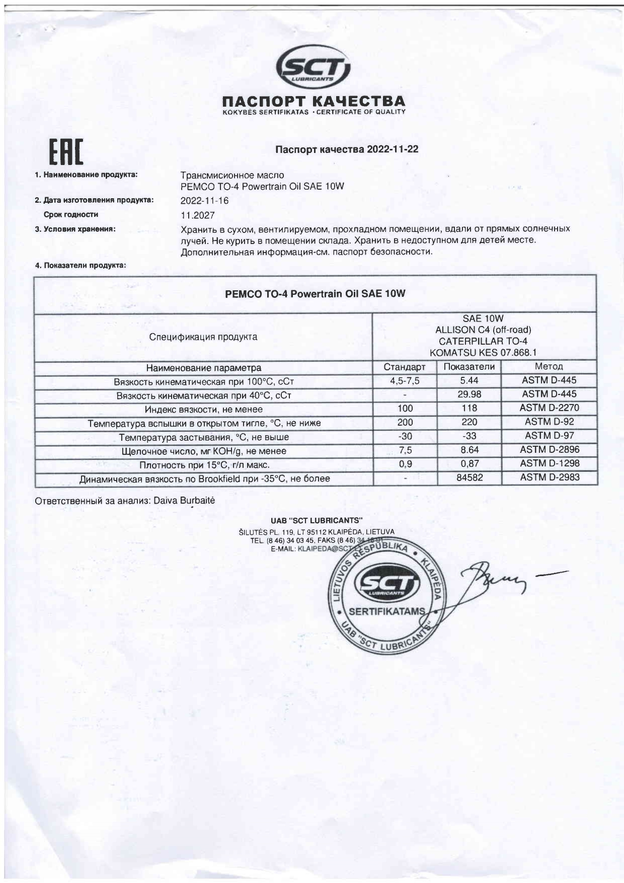 Отвечает жестким требованиям Cat TO-4, предъявляемым к смазочным материалам TDTO (Transmission/Drive Train Oil) компанией Caterpillar. Спецификция TO-4 является отраслевым эталоном. Спецификация определяет эксплуатационные требования, предъявляемый к гидравлическим жидкостям и трансмиссионным маслам для их применения в технике CAT и аналогичной.