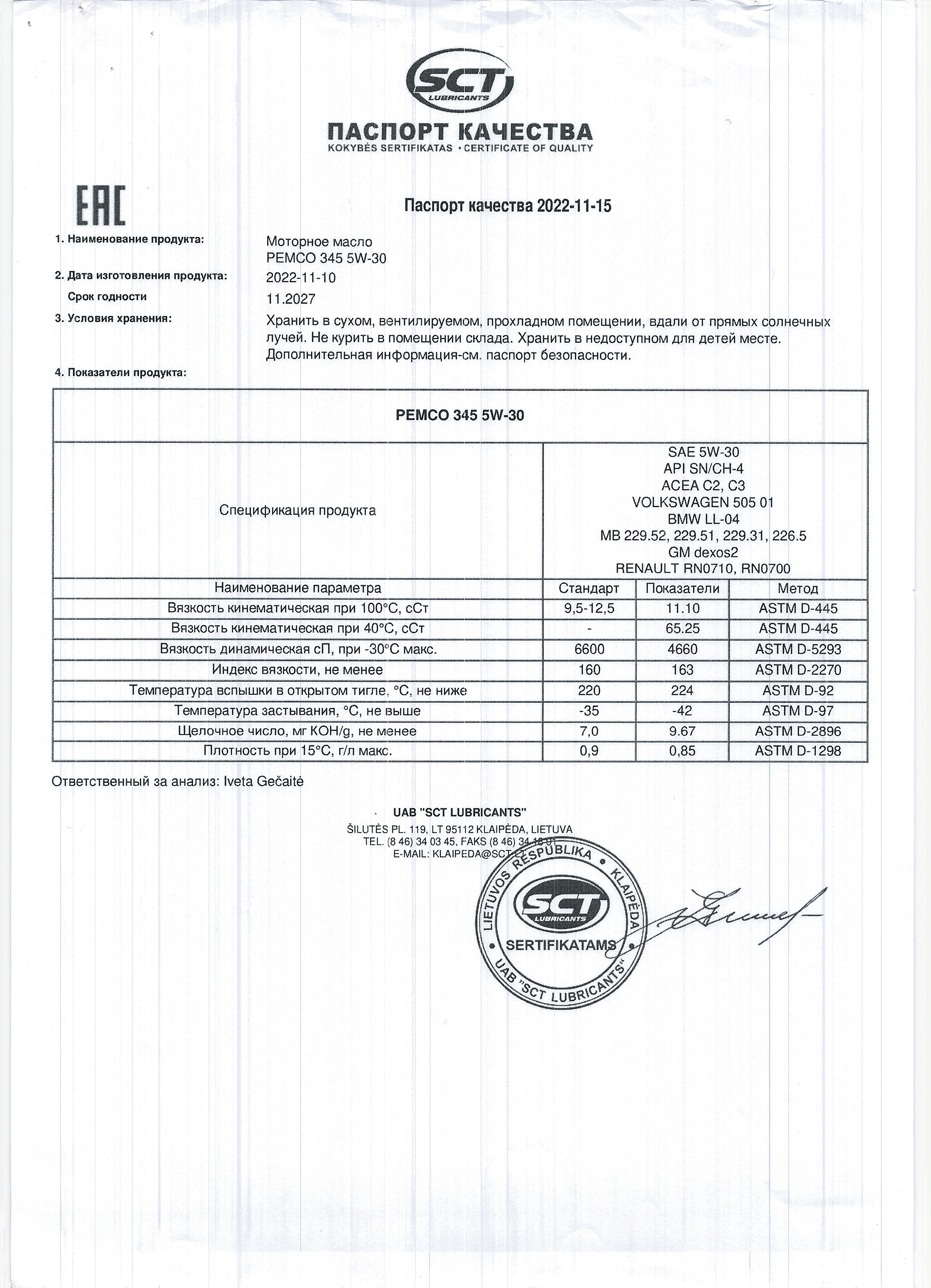 Рекомендовано для применения в двигателях автомобилей Renault предъявляющих дополнительные требования к моторным маслам согласно спецификации Renault RN 0720.