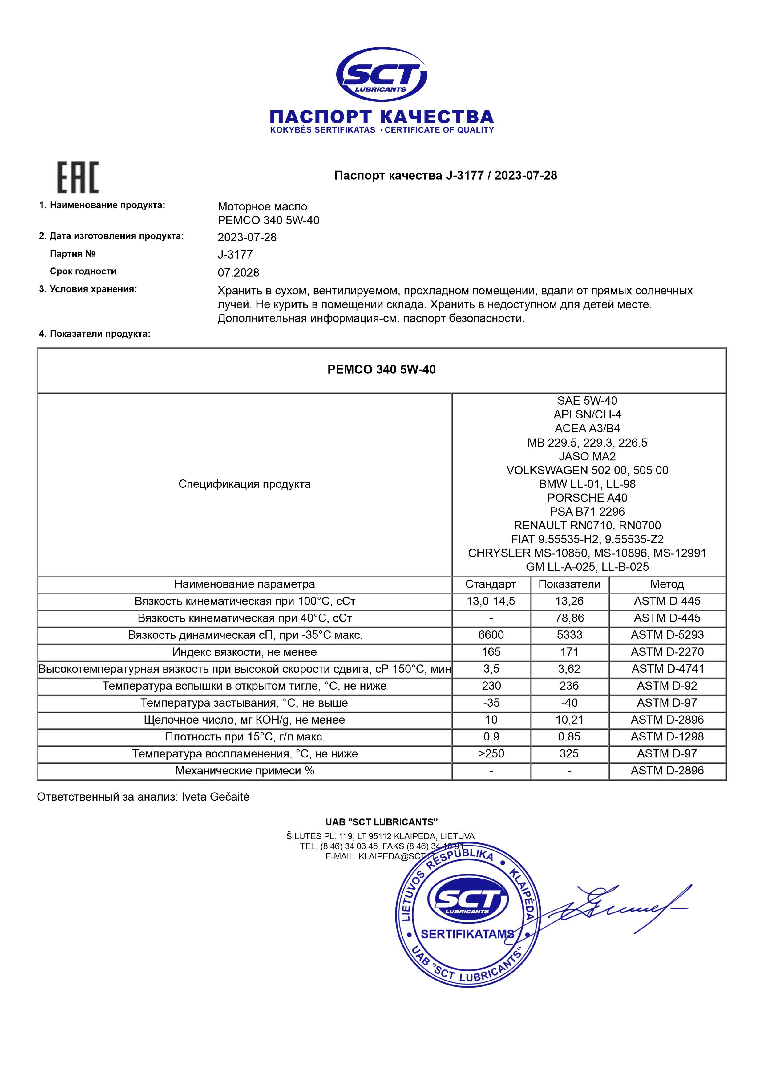 Рекомендовано для применения в двигателях автомобилей Daimler, VW, Opel, GM, Renault предъявляющих дополнительные требования к моторным маслам (согласно указанным выше спецификациям).