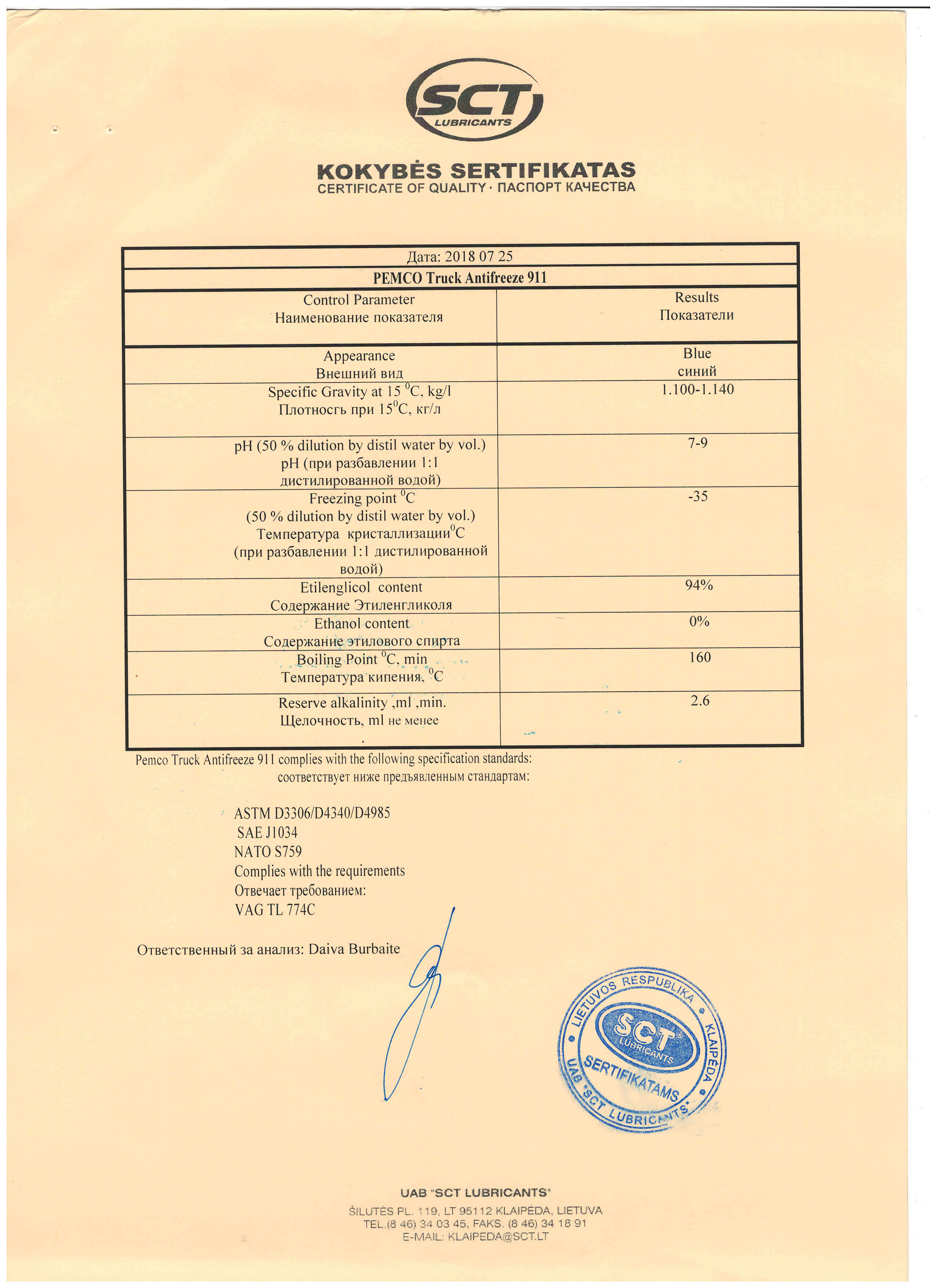 Antifreeze 911 – концентрат (имеется в готовом к использованию растворе (-40)), предназначенный для круглогодичного использования в любых современных алюминиевых и медных системах охлаждения, для которых рекомендуется применение антифризов на этиленгликолевой основе. Предохраняет от коррозии и накипи. Не вспенивается, нейтрален к прокладкам и шлангам. Придает достаточные противокоррозионные свойства уже при концентрации от 20%. Представляет собой низкосиликатную жидкость. Не содержит нитраты и фосфаты.