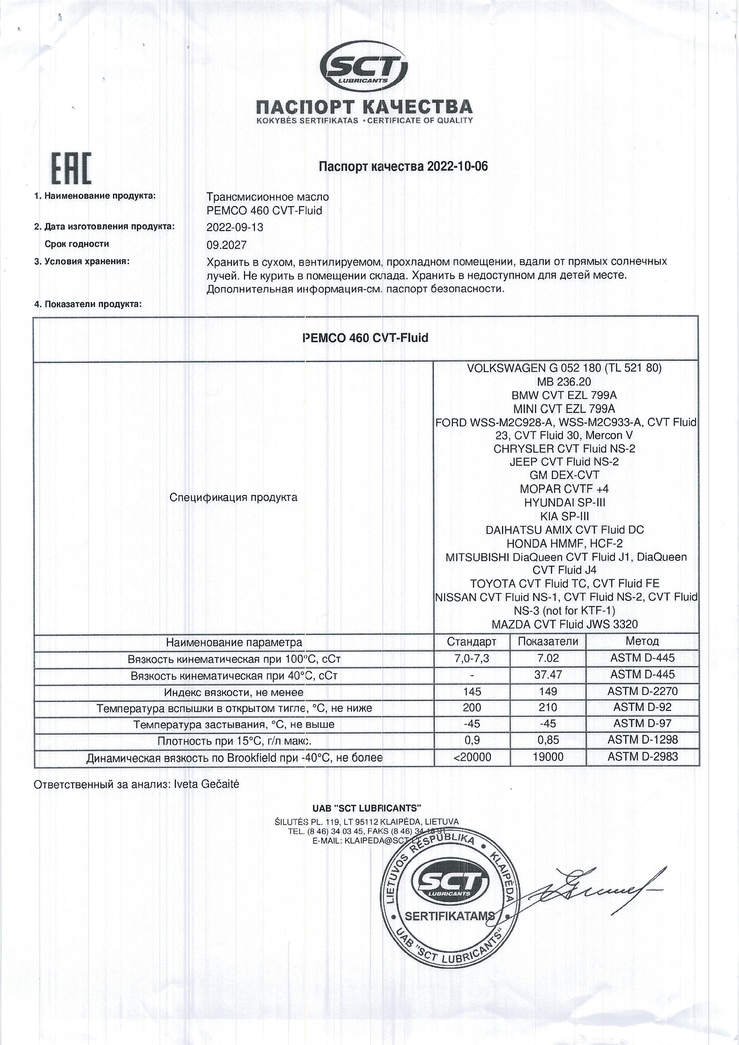 Специальное синтетическое трансмиссионное масло для бесступенчатых трансмиссий (Continuously Variable Transmission, CVT) — вариаторов. Специально разработано для применения в бесступенчатых коробках передач с толкающей шарнирной цепью или тяговой цепью из стали. Обеспечивает бесперебойную работу АКПП, гарантирует минимальный износ, продолжительный срок службы трансмиссии и экономию топлива.