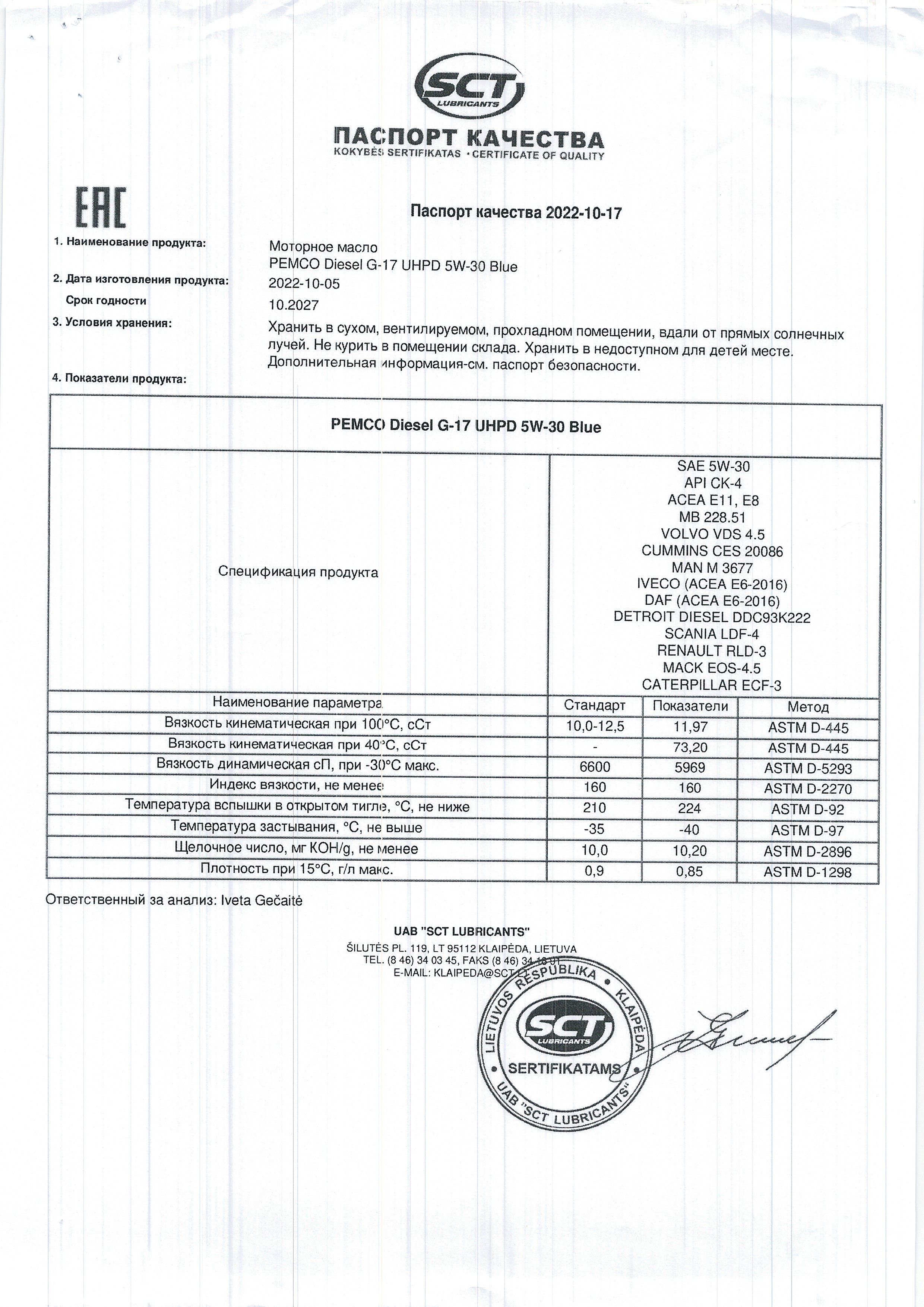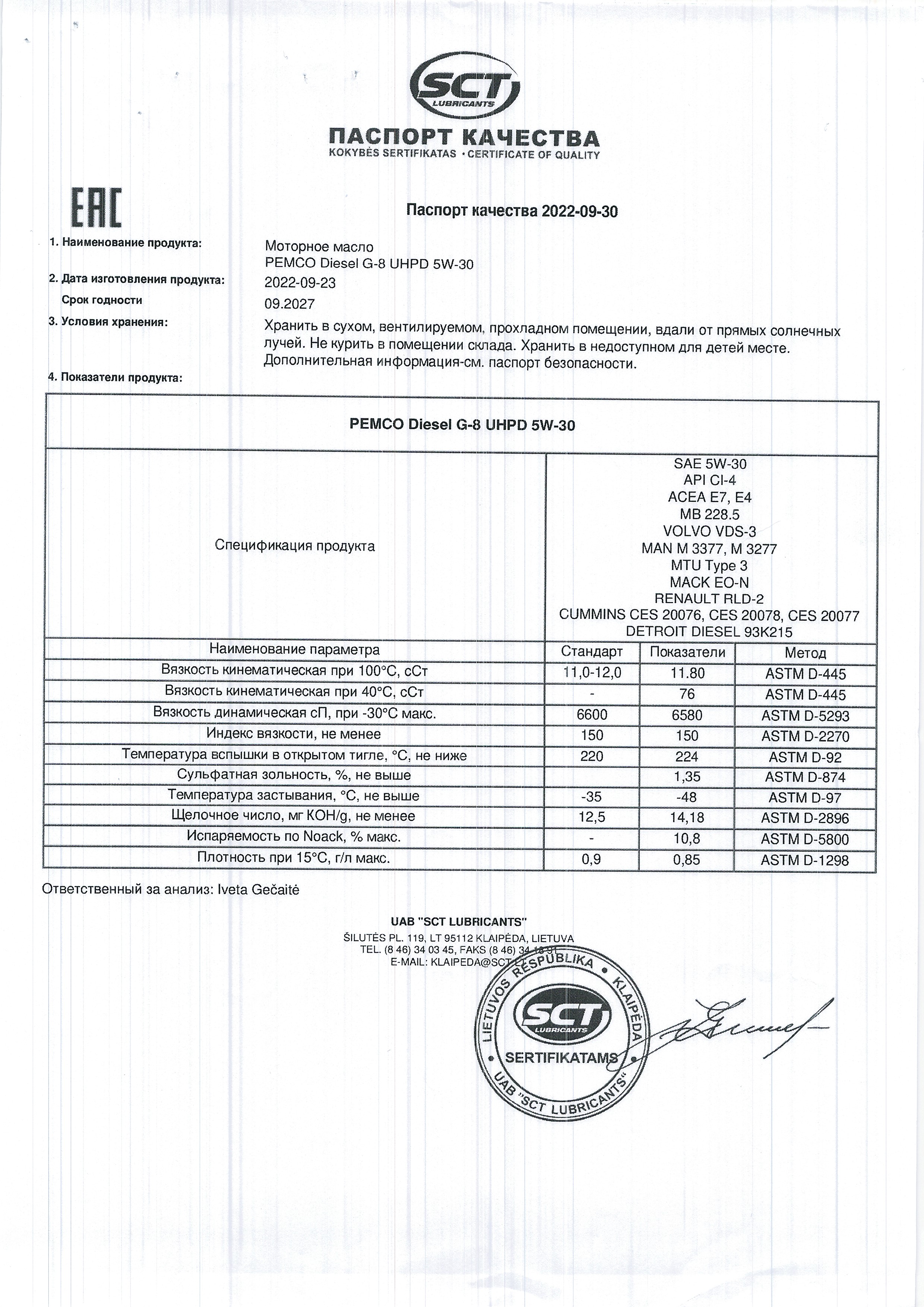 PEMCO DIESEL G-17 UHPD Blue – полностью синтетическое моторное масло, разработано для высоконагруженных турбированных дизельных двигателей, работающих в тяжелых режимах, соответствующих стандартам Euro 3, 4, 5 и Euro 6, оборудованных сажевыми фильтрами (DPF) и трехкомпонентными каталитическими нейтрализаторами (SCR) и специальными системами дожига (EGR). Рекомендуется использовать в европейских, американских и японских дизелях нового поколения, использующих низкосернистое топливо. Обладает высоким запасом моюще-диспергирующих свойств, обеспечивая исключительную чистоту деталей двигателя и минимальный износ стенок цилиндра. Способствует экономичной работе двигателя. Малозольный пакет присадок (low SAPS) с низким содержанием серы, сульфатной золы, фосфора, защищает системы снижения токсичности отработавших газов и продлевает срок их службы. Продукт имеет допуски / соответствует спецификациям / продуктам.