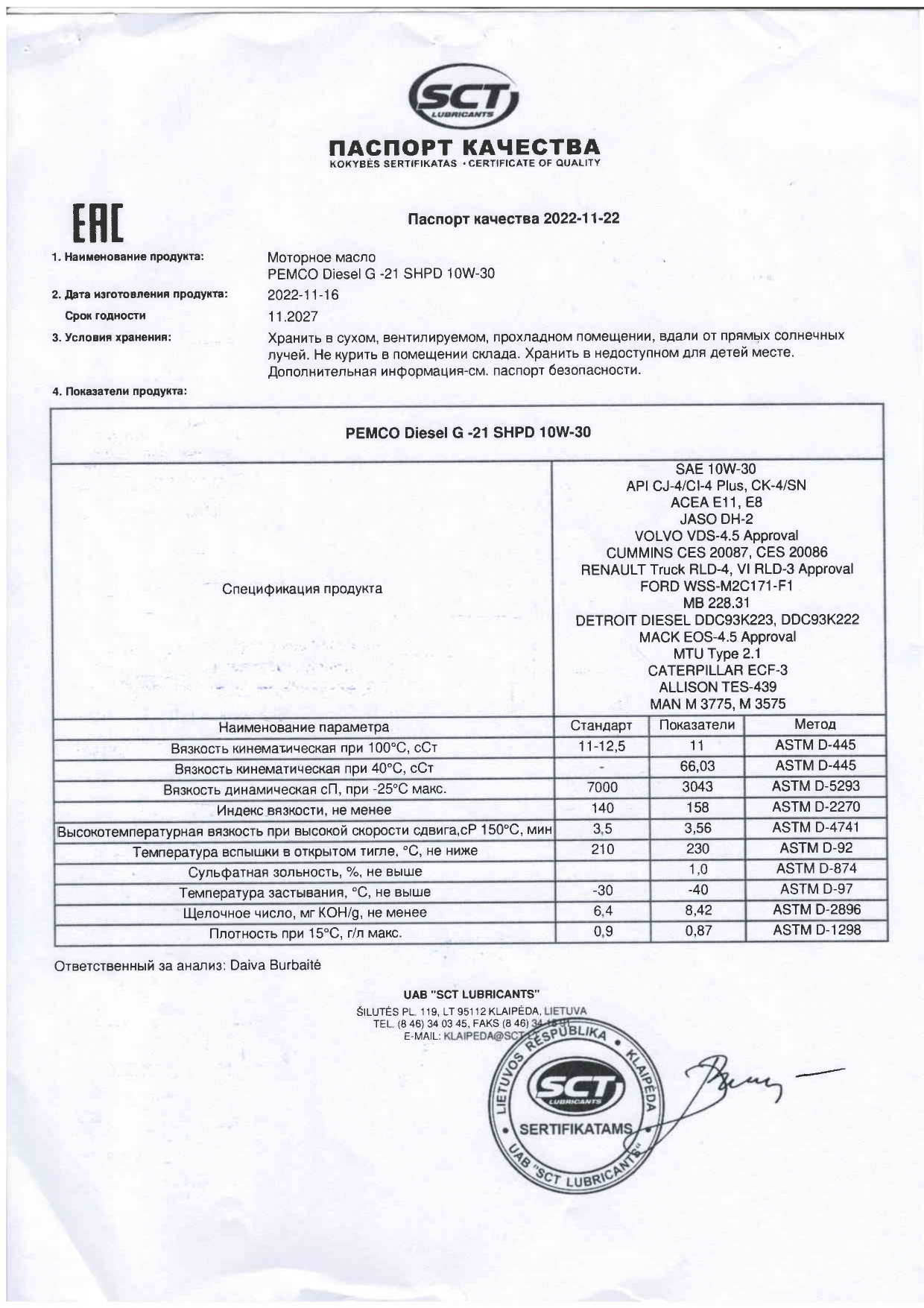 Всесезонное синтетическое моторное масло для высоконагруженных и высокооборотистых дизельных двигателей последнего поколения с турбоннаддувом и без, работающих в тяжелых условиях и использующих низкосернистое топливо. Масло прошло дорожные и лабораторные испытания в центрах VOLVO, MACK и RENAULT и имеет их письменные одобрения.