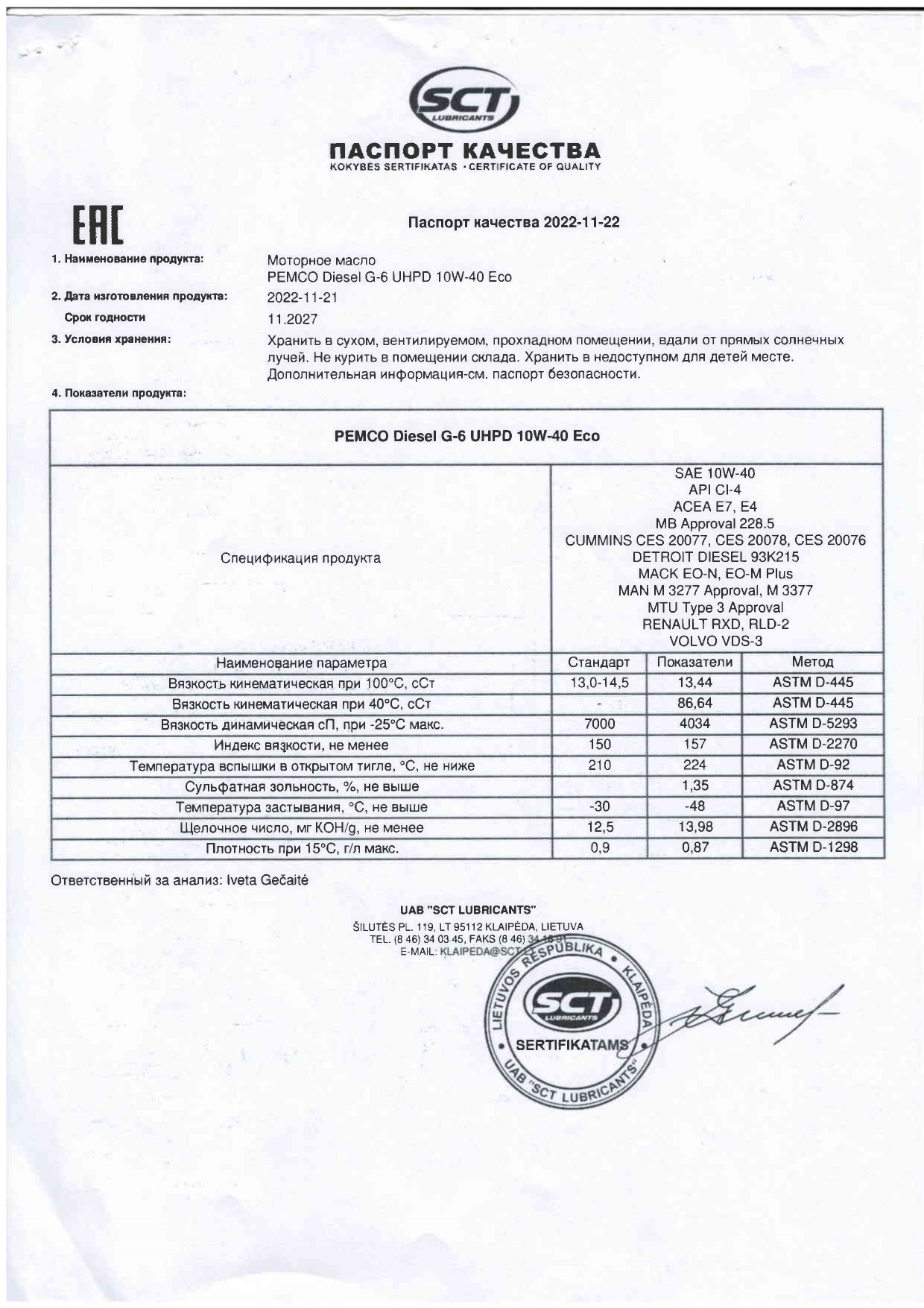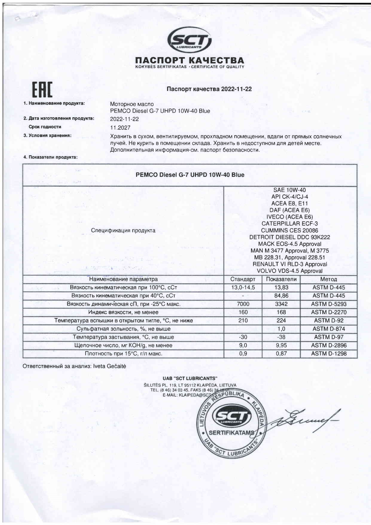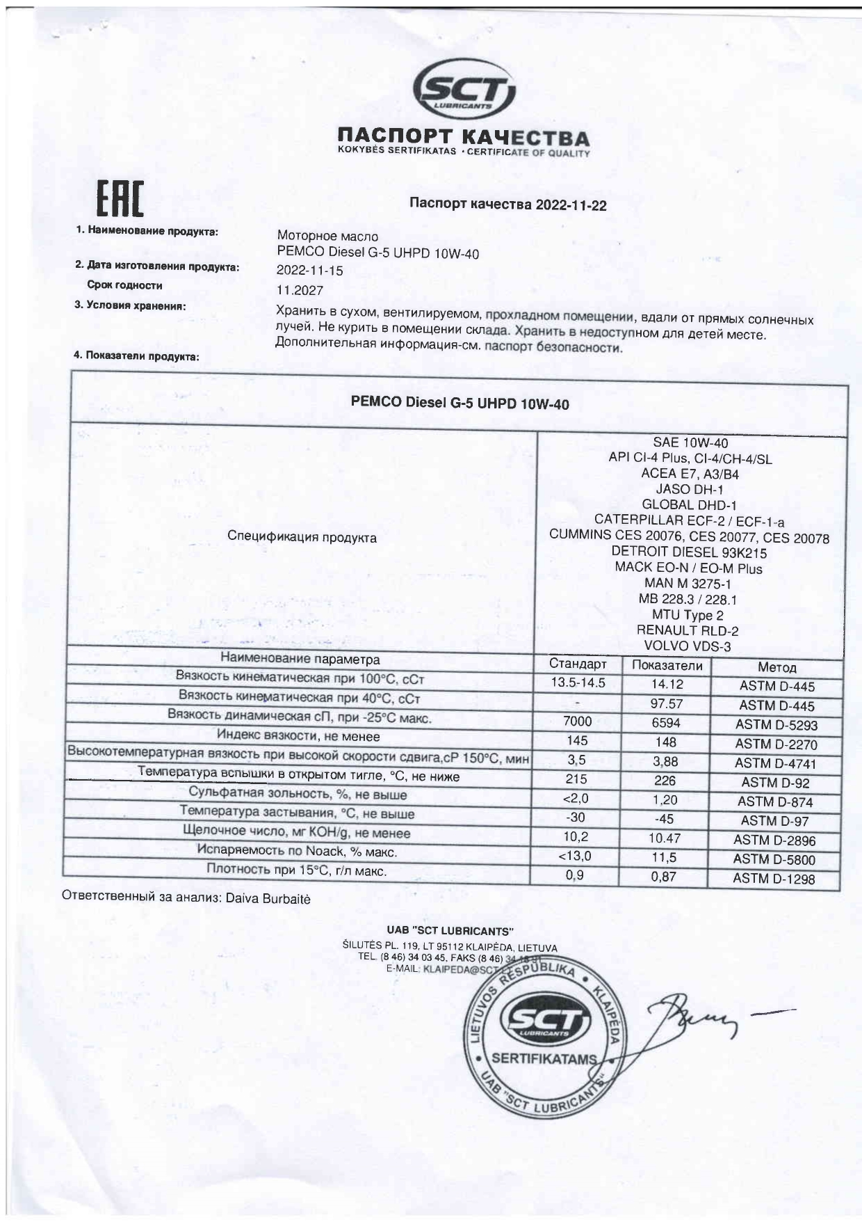 Всесезонное синтетическое моторное масло для высоконагруженных и высокооборотистых дизельных двигателей последнего поколения с турбоннаддувом и без, работающих в тяжелых условиях и использующих низкосернистое топливо. Масло прошло дорожные и лабораторные испытания в центрах VOLVO, Mercedes-Benz, MAN, MACK и RENAULT и имеет их письменные одобрения.